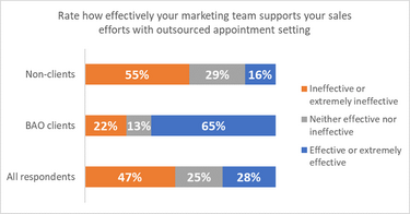 Overall, only 28% of respondents rated their marketing teams as effective or extremely effective when it comes to outsourced appointment setting. But when we break the responses out based on whether they’re BAO clients, we found a stark difference. In organizations that don’t work with BAO, the number plummeted to 16%. But in client companies, the effective or highly effective rating was at a staggering 65%.