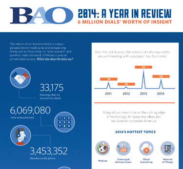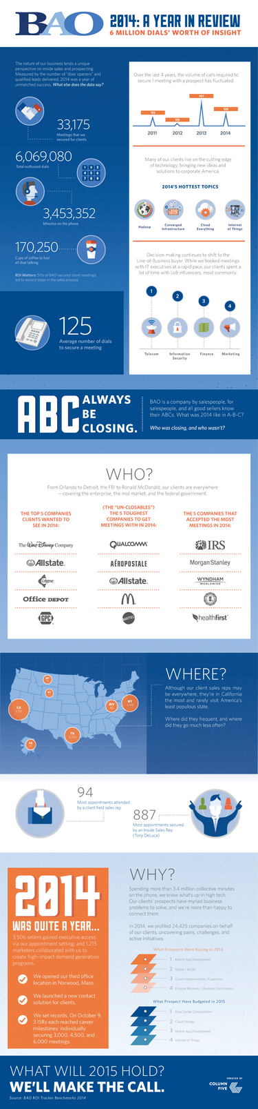 More than 6 million dials in the making, we took a look back at 2014 to understand the past year in lead generation. Prospecting is often described as an art and a science. With our appointment setting scale (33,175 appointments secured in 2014) and metrics-driven mindset, our Year in Review lets the data do the talking and the science shine through.