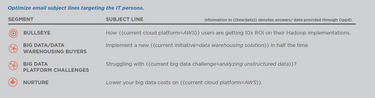 The key to integrating OppID insights into your email marketing is your segments. For the example provided above, segments include Bullseye, Big Data/Data Warehousing Buyers, Big Data platform challenges and Nurture. Companies in each unique segment should be put into a different email track that aligns with segment criteria for each.