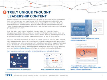 We’ll use ourselves as example. In 2019, in an OppID project of our own, BAO profiled field sales executives across 197 organizations to better understand their relationship with marketing and sales development. We asked them about their biggest challenges, quota attainment, how their sales development team is structured, and more. Once we’d collected all the results, we crunched the data to see what conclusions we could draw and published a trend report, which performed extremely well on LinkedIn.