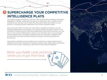 Your OppID insights provide you with the most accurate and influential competitive intelligence available. Unlike online tools - this is insight into the companies you selected, with exactly the prescriptive data that matters to your business, including exposed weaknesses and contract expiration dates.