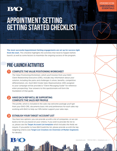 The most successful Appointment Setting engagements are set up for success right from the start. This checklist highlights the activities that need to happen before launch, as well as some factors to maximize the ongoing success of the program.