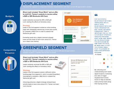 Strategy: Leads in the 3rd segment visited a different online landing page from segment 2, which included Greenfield messaging to complete a Web form to redeem the Starbucks gift card. Choosing primarily a digital strategy allowed lower priority leads to learn more about O.C. Tanner via lower cost channel.
