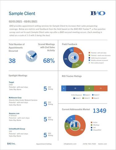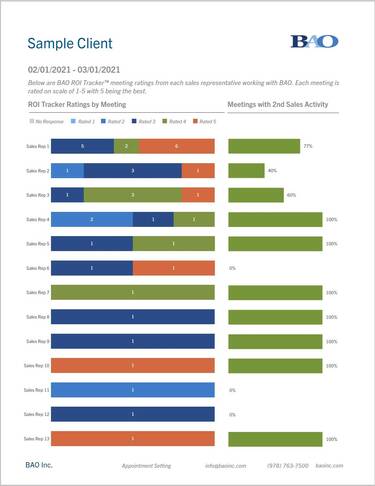 Every month, BAO clients receive a dashboard report that compiles metrics and feedback from the field based on the BAO ROI Tracker™, a five question survey sent out to each sales rep after a BAO secured meeting occurs. Each meeting is rated on a scale of 1-5 with 5 being the best.