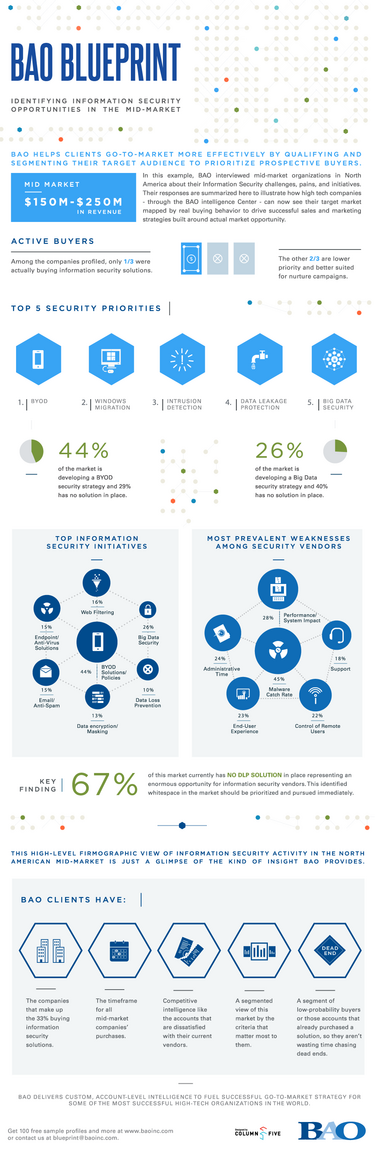 This infographic summarizes info security challenges, pains, and initiatives in the Mid Market.