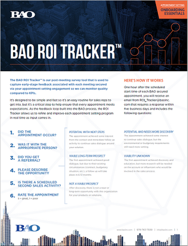 The BAO ROI Tracker™ is our post-meeting survey tool that is used to capture early-stage feedback associated with each meeting secured via your appointment setting engagement so we can monitor quality compared to KPIs.